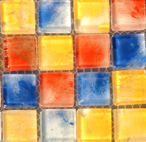 Use for bathrooms, kitchen backsplashes and walls, showers, borders. Bring in color to any room in your house. This stunning glass tile includes beautiful colors of yellow, red, blue, and white. This glass mosaic tile is made from high quality 1/3" thick tempered art glass. 7/8" x 7/8" squares of double-welded mosaic glass chips are glued to a mesh backing to preserve durability and allow for easy glass tile installation. Double-welding of this mosaic tiling is rendered to ensure a long-lasting glass tile. The underside of the glass mosaics are hand painted artistically with a brush to provide you with a unique mosaic design.