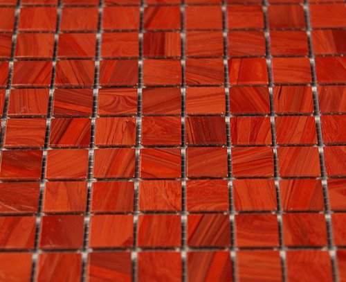 Tile can be used on interior or exterior, residential or commercial projects such as walls, bathrooms, kitchens, flooring, and swimming pools. This glass mosaic tile is made from high quality 1/8" thick tempered art glass. 3/4" x 3/4" squares of mosaic glass chips are glued to a mesh backing to preserve durability and allow for easy glass tile installation. This mosaic tile has a polished, clean finish. This glass mosaic model consists of glass tiles with red and burgundy shades of color. The glossy finish of the mosaic gives the glass tile a sleek appearance.